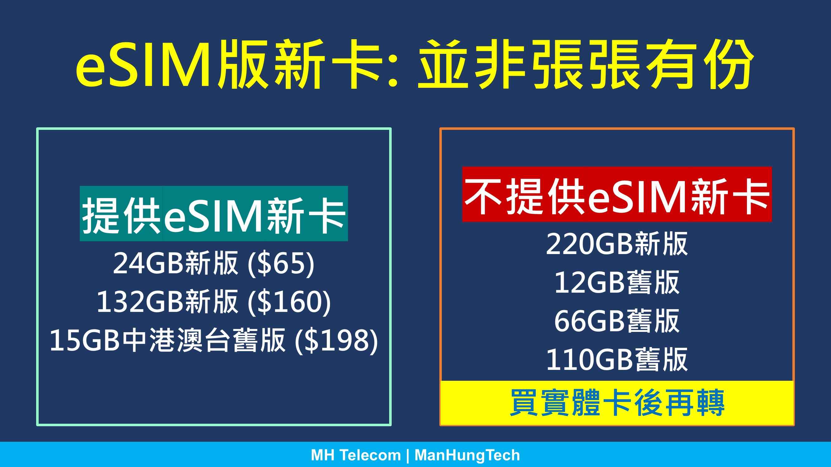 - 兩款選擇,其中一款供應 eSIM 新卡