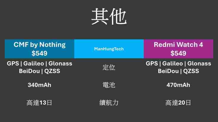 電池及續航力卻是另一關鍵分別,相信大部分人討厭頻繁為手錶充電,紅米無疑大佔上風,電量比 Nothing 多出 130mAh,也不難解釋續航力有別。