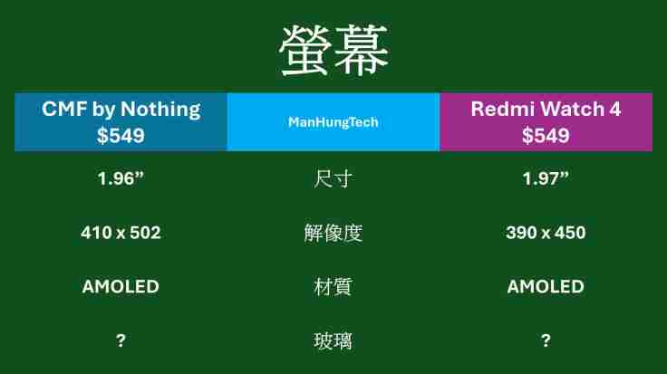 兩款手錶螢幕尺寸僅相差0.01吋,不如索性當一樣。接著,CMF by Nothing Watch Pro 解像度較高,在同一尺寸下,可知顯示細緻度勝過紅米 Watch 4,無疑是前者優點。