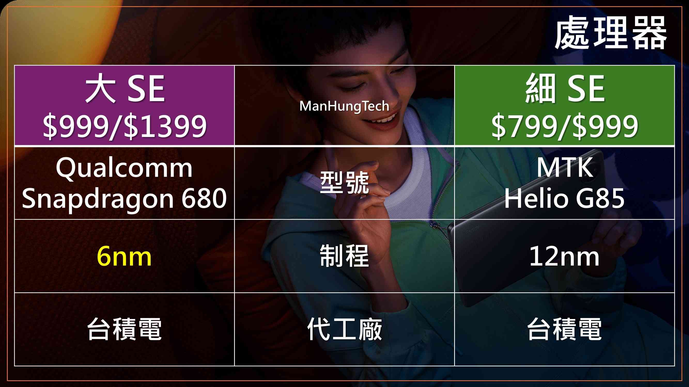 細 SE 的 MTK Helio G85 乃2020年老產物,小米旗下 Redmi 13C、Poco C65 廉價智能手機同樣採用,制程不及大 SE 的 Qualcomm Snapdragon 680,後者總算以較先進的 6nm 技術生產。