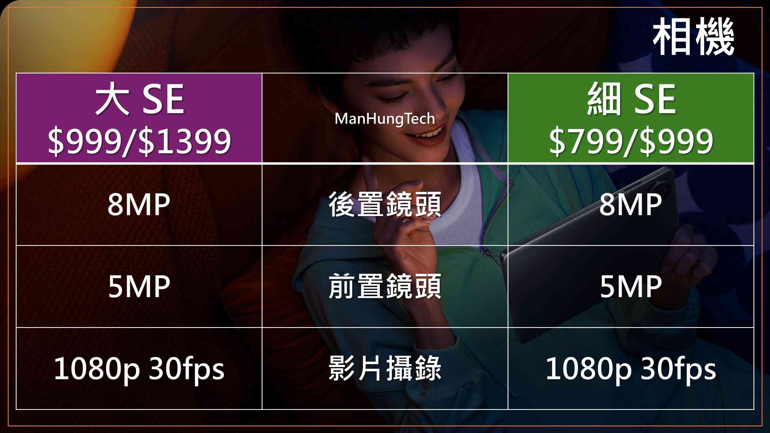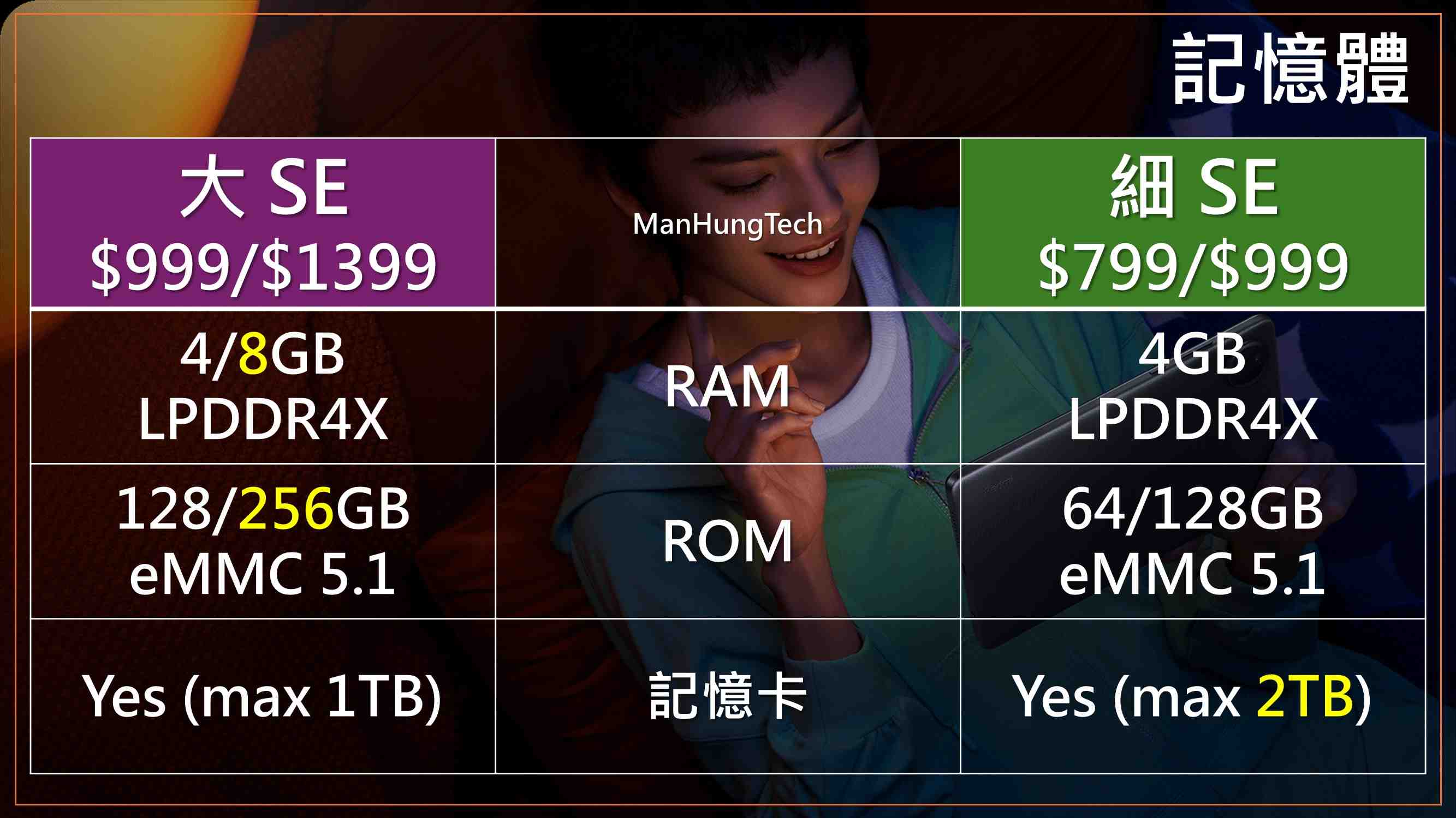 細 SE 現時提供 4GB、6GB RAM 兩種規格 (上圖出自舊片),與大 SE 最高 8GB RAM 仍有一段距離。個人認為,假如本身不需要流動網絡,只為了多加 64GB 儲存空間而多付二百元選擇 4G 版本似乎不太划算,倒不如以同等消費買一張容量更大的 MicroSD 記憶卡。