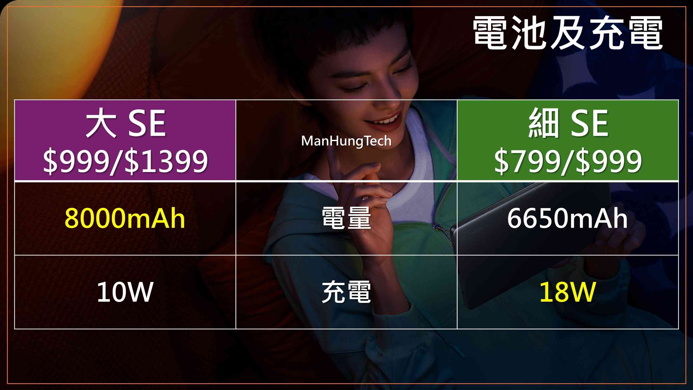 先比較電池,大 SE 電池容量較多乃理所當然,細 SE 始終受到機身體積所限,難以容納與大平板相等的電池。