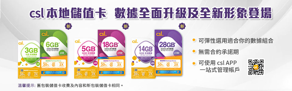 三款 csl. 自家品牌儲值卡 ($48、$100、$180) 設語音組合,每30日收費$28,包含10000分鐘本地通話。全部提供網上自助 MNP 轉台,並且支援 VOLTE。