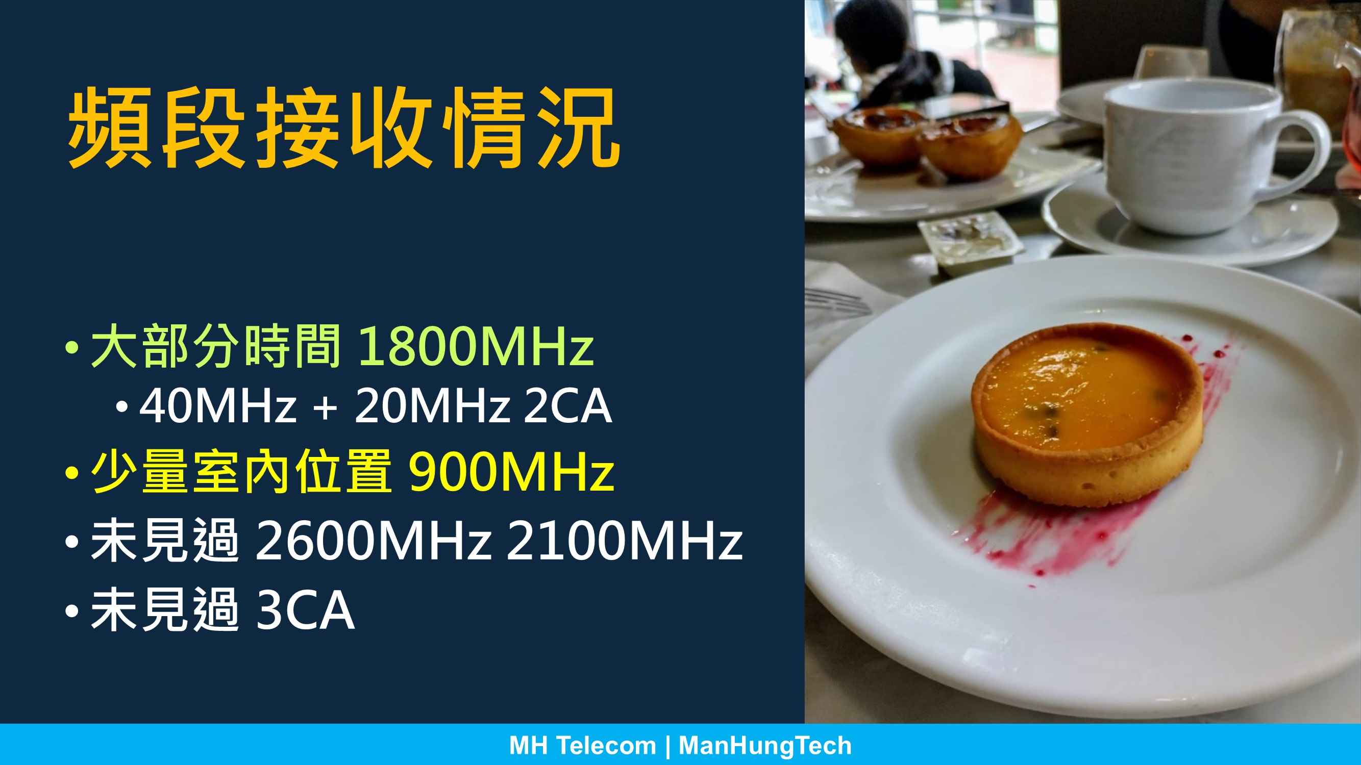 當日不時以 Netmonster 觀察頻段接收情況,發現大多數時間以兩段 1800MHz 組成 2CA 傳輸,頻寬為 40MHz、20MHz (按: CTM 雖擁有 60MHz 連續頻寬,但 4G 單一頻段最多容納 40MHz,故拆分兩段配以 CA 技術融合使用)。只有少數室內環境,才會接收 900MHz 低頻。