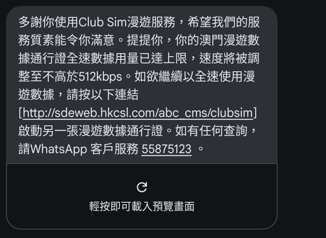 注意: 無合約 Club SIM 不支援漫遊通話及短訊發送服務