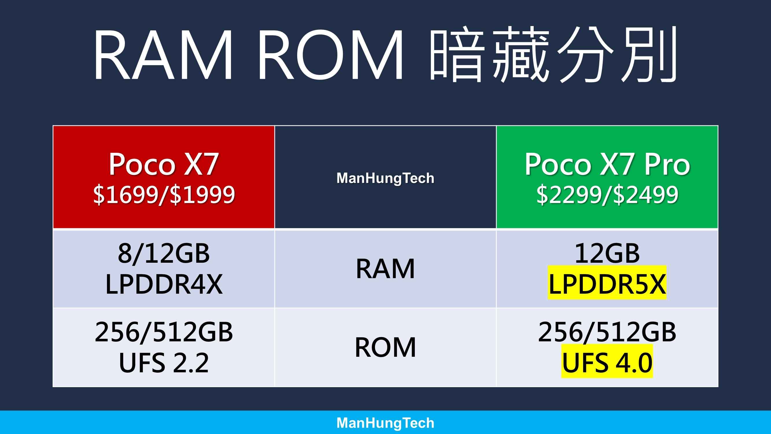 真正分別在於記憶體讀寫速度,Poco X7 雙傑繼承前代策略,暗中以記憶體級別及成本劃分。答案顯而易見,Pro 配備讀寫速度較快的 LPDDR5X、UFS 4.0,拍得住高階機。