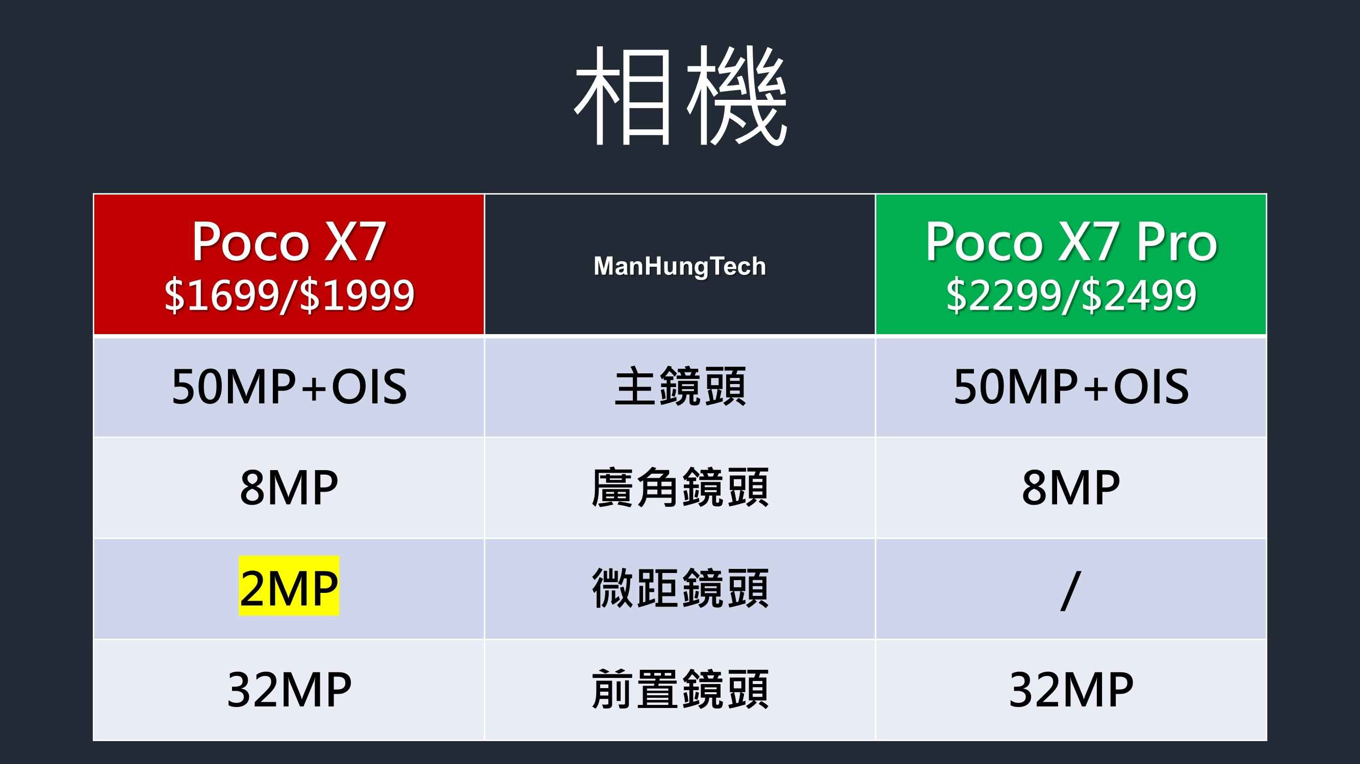 Poco X7、Poco X7 Pro 相機配置幾乎一模一樣,價格較低的 Poco X7 多一個可有可無、毫不實用的200萬像素微距鏡頭,總算多一個跑贏 Poco X7 Pro 的地方。由此可見相機規格並非選機思考因素,廠商集體入貨與調校有助減低平均成本。