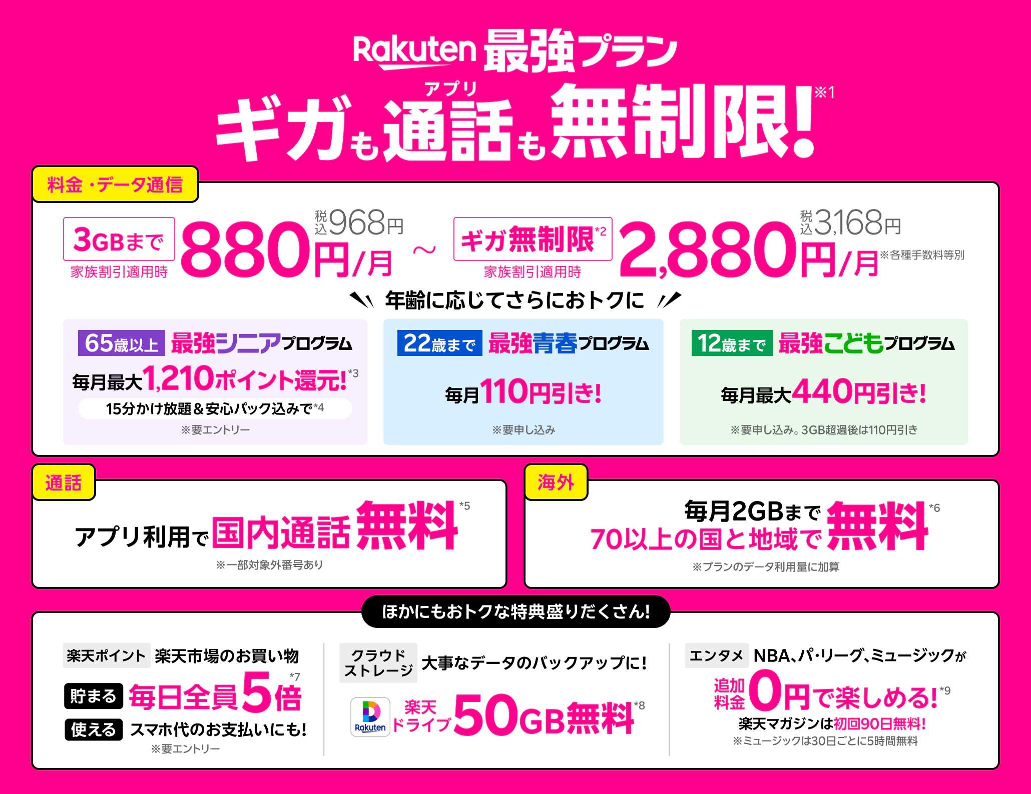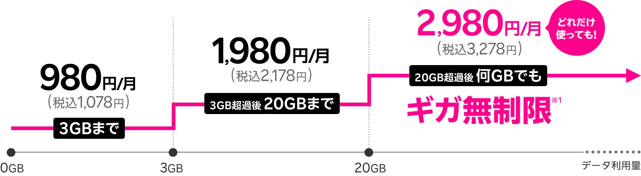 Rakuten Mobile 採取三級制收費,分為 3GB、20GB、無限三款計畫,根據每月實際數據用量決定最終收費,簡單俐落。以正價計算,最平月費1078円包含 3GB 用量, 20GB 以上無限制上網3278円。全部支援 5G、4G 網絡,並包含 Rakuten Link 國內無限通話分鐘 (見下文)。