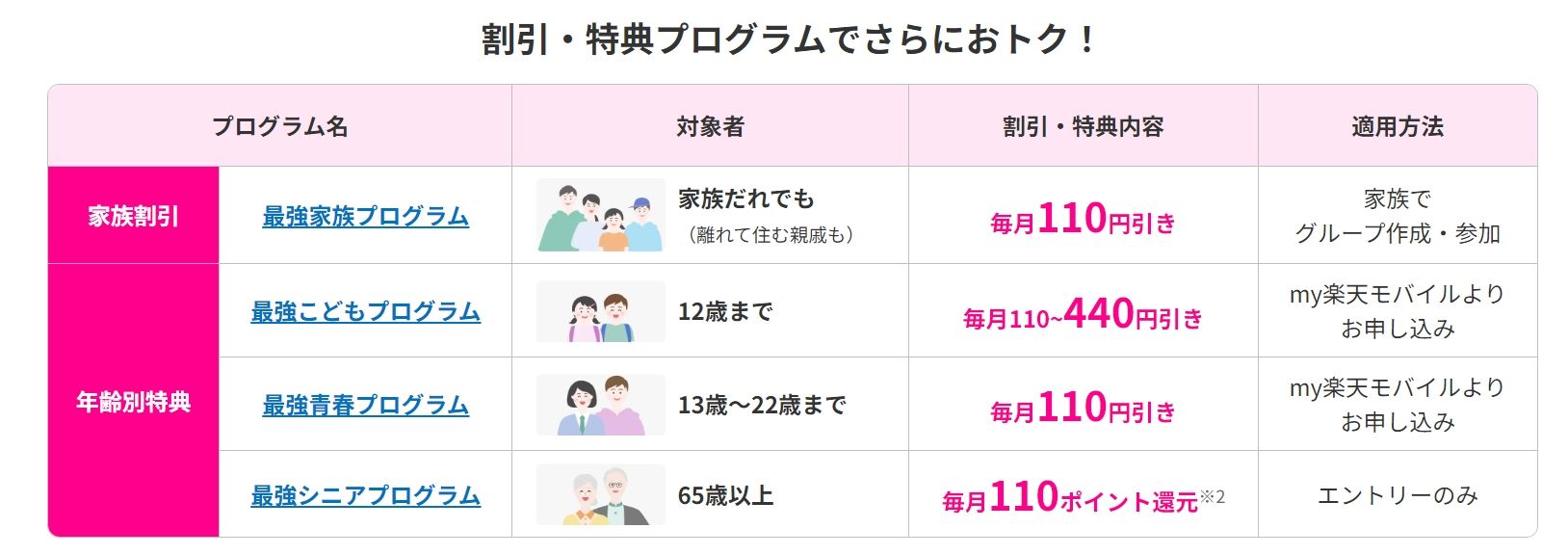 - 十二歲或以下 (最強こどもプログラム): 每月110円至440円折扣