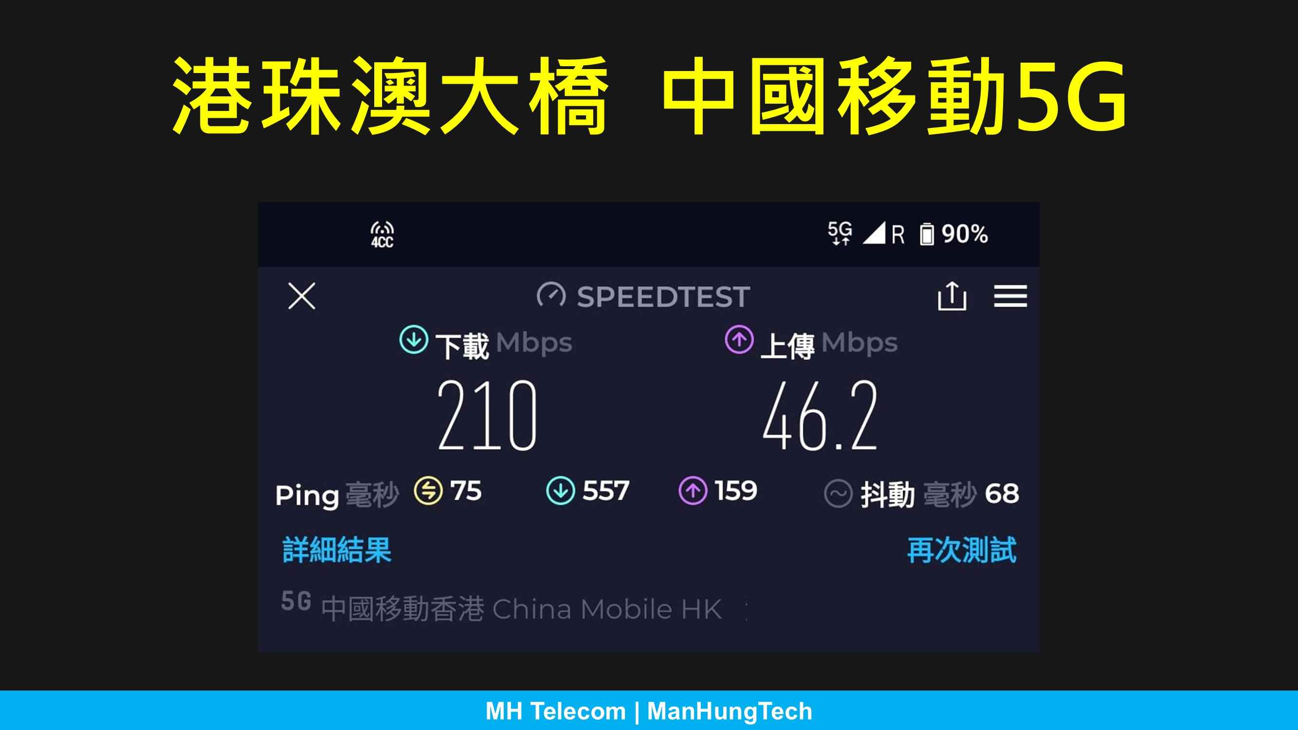 即使限速,回程於港珠澳大橋仍可接收中國移動 5G 網絡,可是此刻 5G 意義不大,實際網速與三次 4G 測試無疑。另外,時延與全速期間相若,未有因限速而受影響。