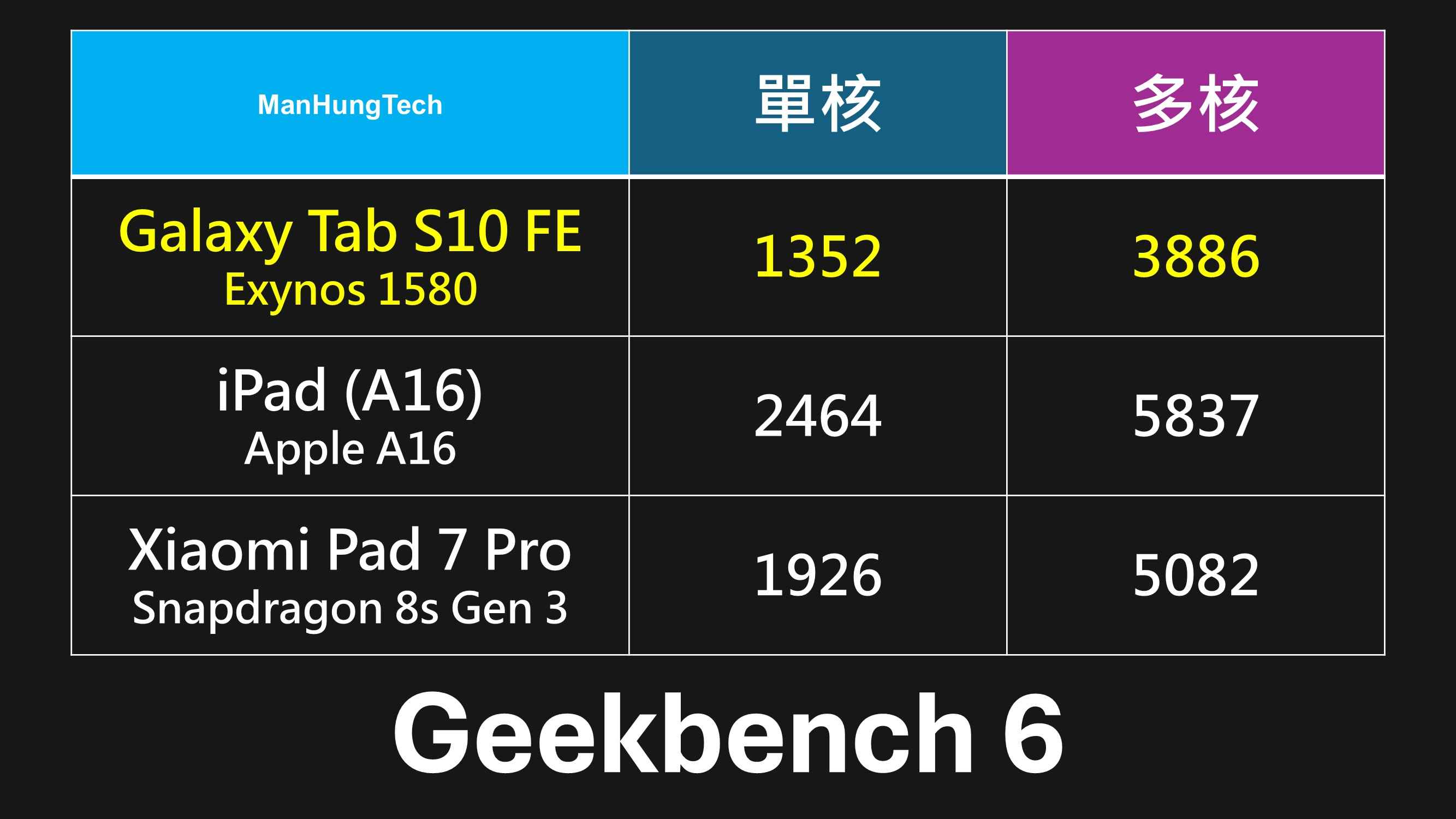 Samsung Galaxy Tab S10 FE、Galaxy Tab S10 FE+ 分別定價港幣3788、4788起,多核得分竟然慘輸 iPad A16 (iPad 11) 所使用的 Apple A16 處理器,落後接近二千分,運算能力差距慘不忍睹,然而後者僅三千元有找。