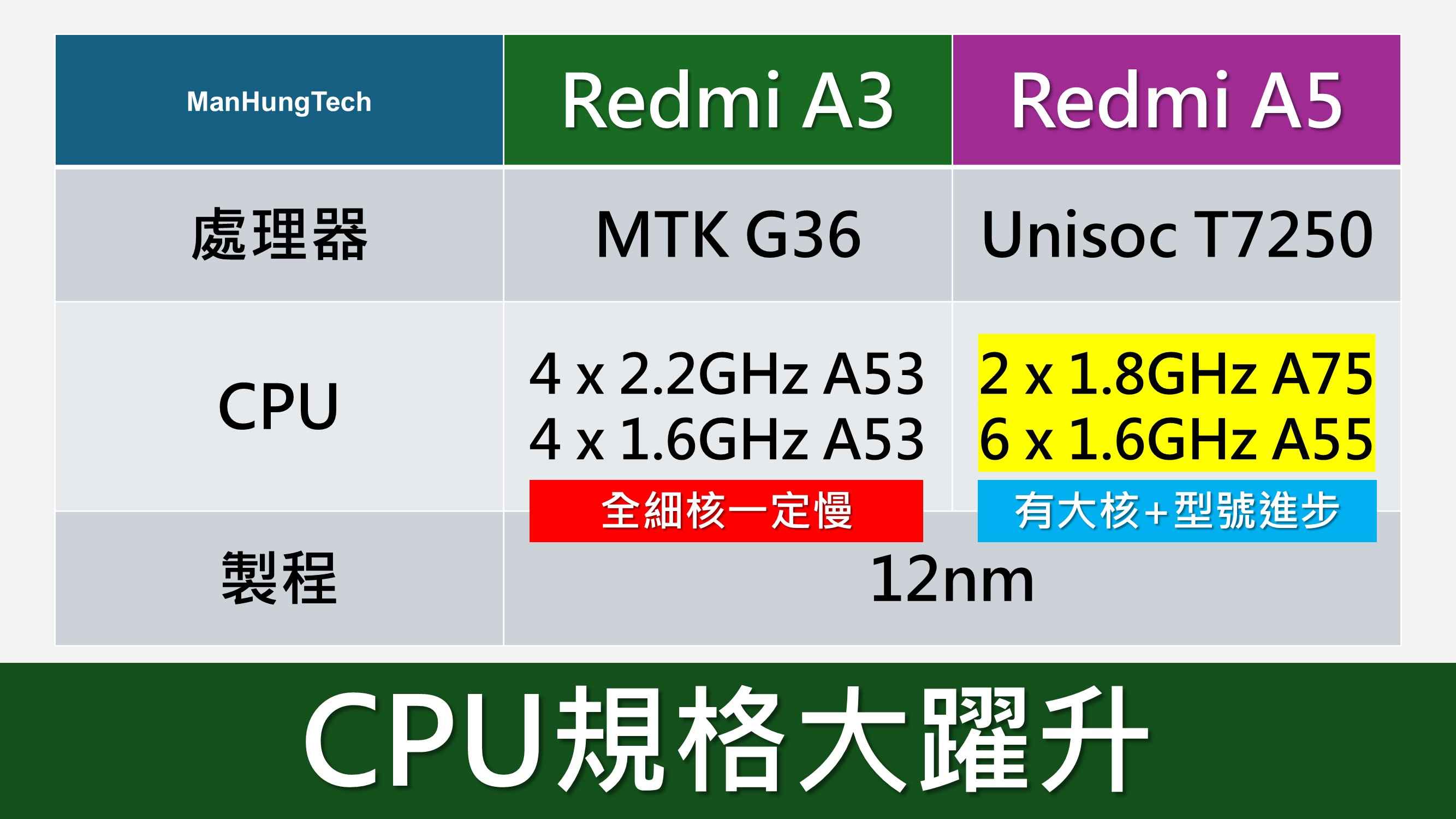 與此同時,Unisoc T7250 的 CPU 規格遠勝上一代紅米 A3 所採用的 MTK Helio G36,後者全數細核,性能差距可謂天淵之別。