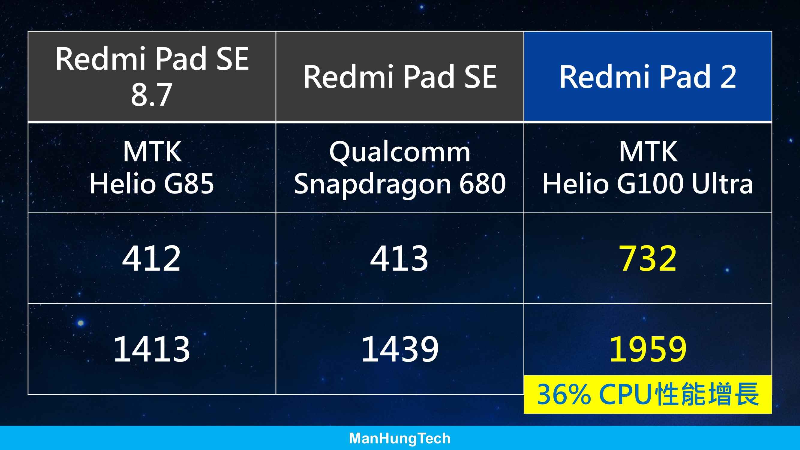Redmi Pad 2 配備 MTK Helio G100 Ultra 處理器,CPU、GPU 規格與 Redmi Note 14 4G 的 Helio G99 Ultra 完全相同,性能較前代的 Qualcomm Snapdragon 680 大有提升,除非買家對高通情有獨鍾。