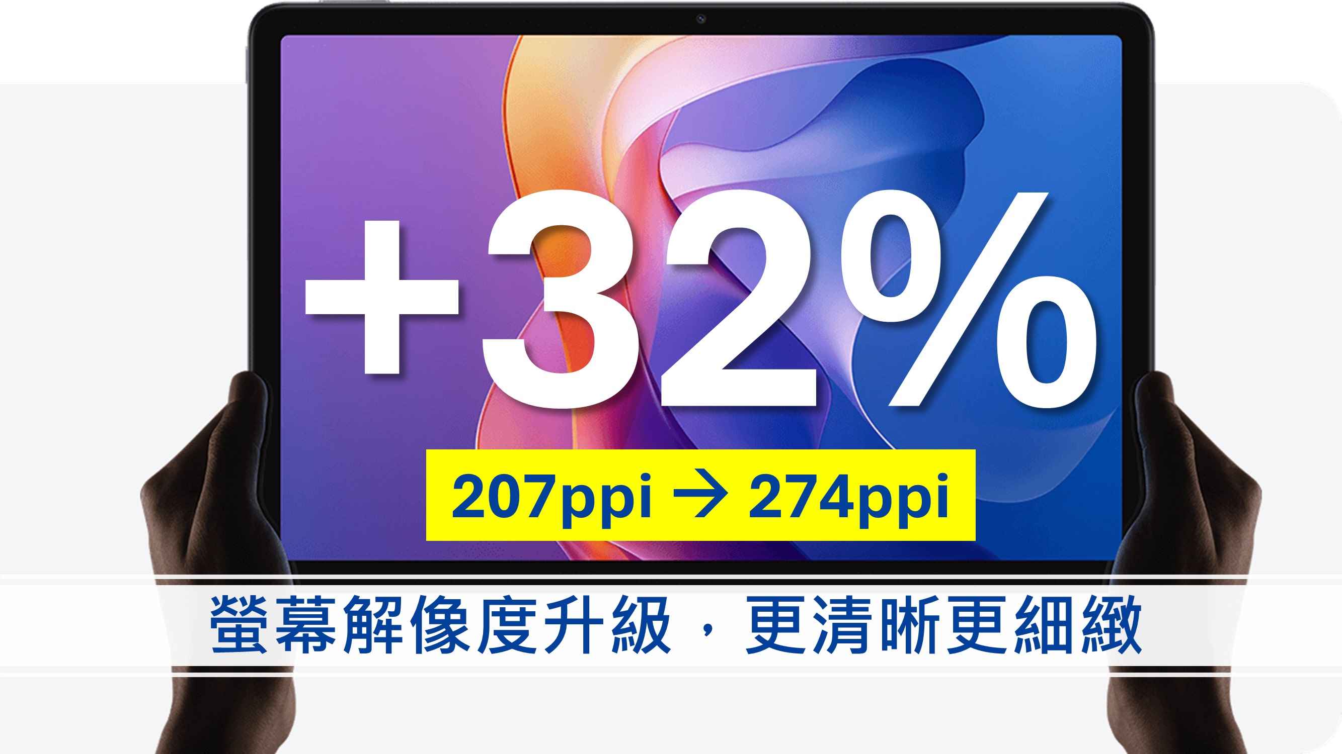 今代維持 11″ 尺寸、90Hz 刷新率,不過顯示清晰度獲顯著改良,透過增加解像度,細緻度由 207ppi 提高至 274ppi,還要比最新 iPad A16 高出少許。畫面更清晰,視覺體驗更佳,對日常使用大有裨益,同時與同門 Redmi Pad SE 8.7 成鮮明對比。