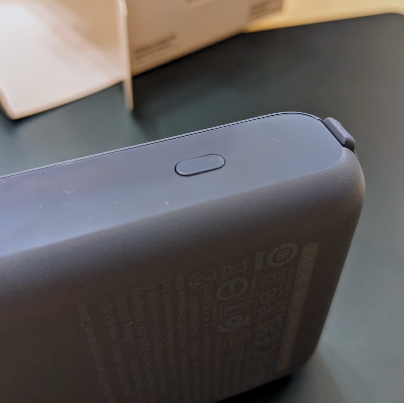 內置的充電線,長度適中,優點在於輸入輸出皆可,可以直接插入 USB Type C 充電器補充電力。不過 Man 認為線材偏幼弱,使用時建議多加小心,否則恐怕容易破損,官方說明同時建議不得靠線材吊住手機或充電器