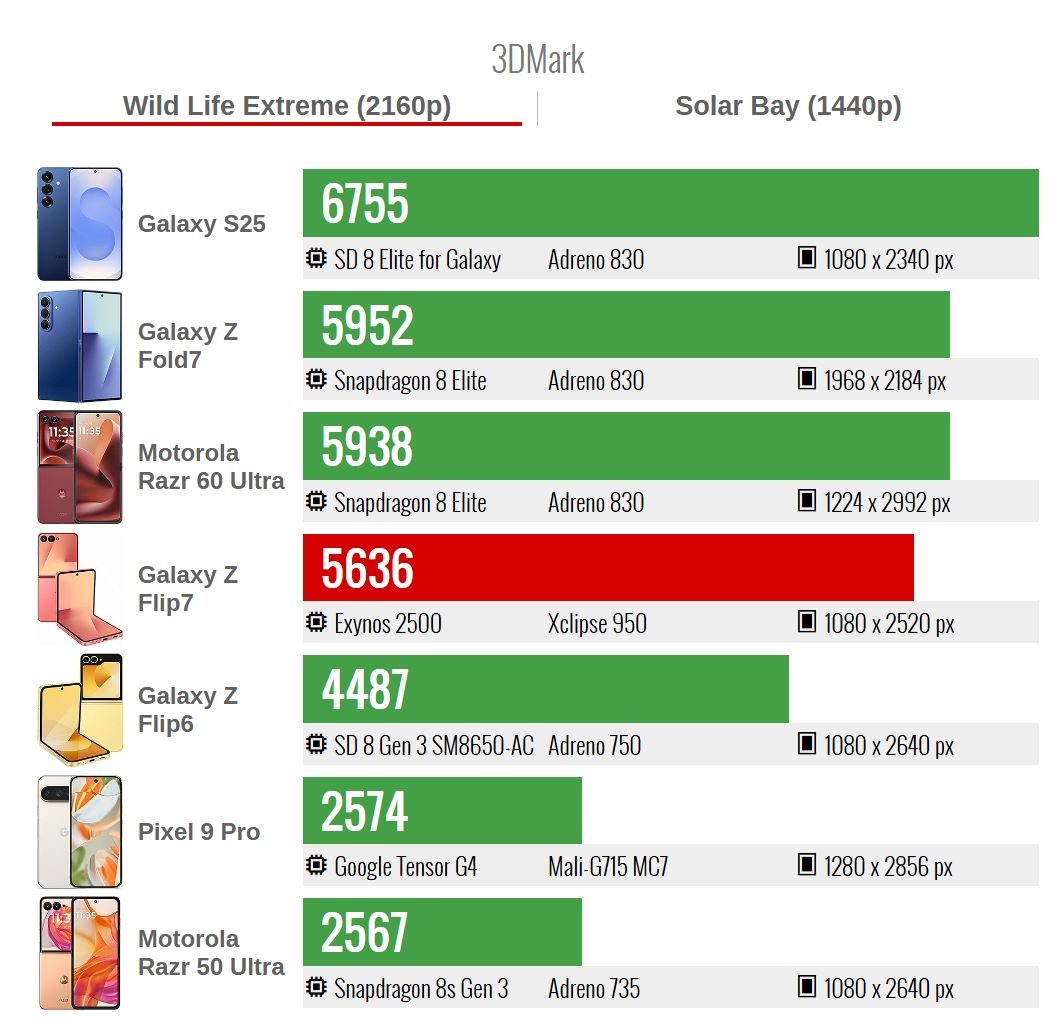 簡而述之,Exynos 2500 未能登上今代旗艦級之列,落後於各大廠商最新晶片。多核得分介乎 Snapdragon 8 Elite 與 8 Gen 3 兩代旗艦之間,至少勝過 8 Gen 3 for Galaxy,代表 Galaxy Z Flip7 性能在 Z Flip6、Galaxy S24 之上,惟差距有限。