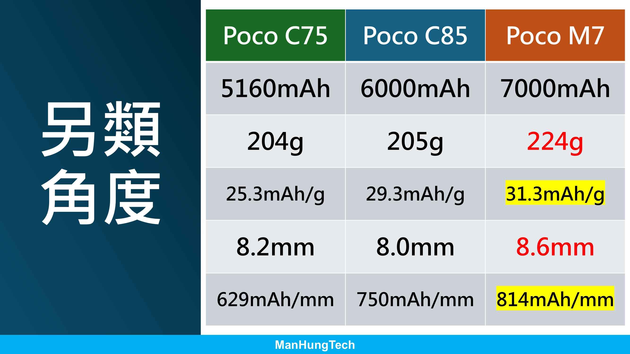 本文主要比較 Redmi 15C、Poco C85、Poco M7 規格,後者坐擁 7000mAh 特大電量,並藉此探討大電量對機身重量及厚度的影響,方便各位作出合適購買選擇。