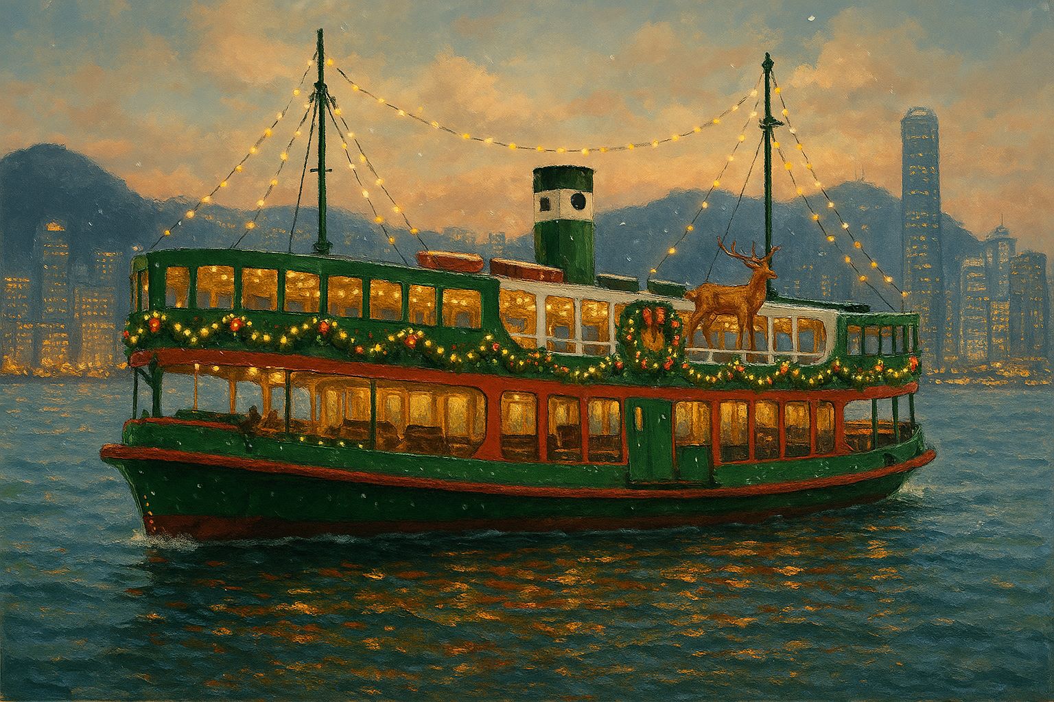 | 聖誕版天星小輪 | 「將天星小輪漆成紅綠色聖誕主題,甲板上有馴鹿模型」 | Oil painting style |