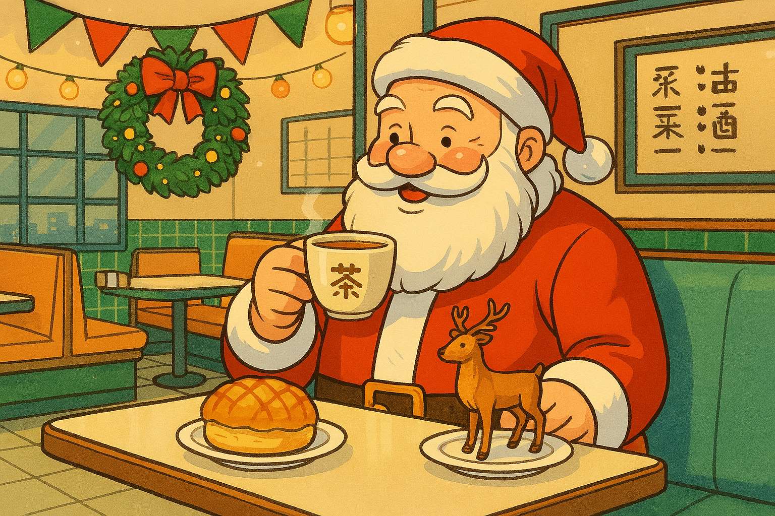 | 聖誕老人突擊茶餐廳 | 「港式茶餐廳內,聖誕老人在喝絲襪奶茶,桌上有一碟菠蘿包」 | Cartoon illustration |