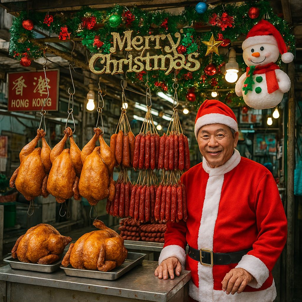| 香港街市聖誕美食 | 「香港街市檔口同時賣火雞與臘腸,掛滿聖誕裝飾,店主換上聖誕服飾」 | Fantasy illustration |