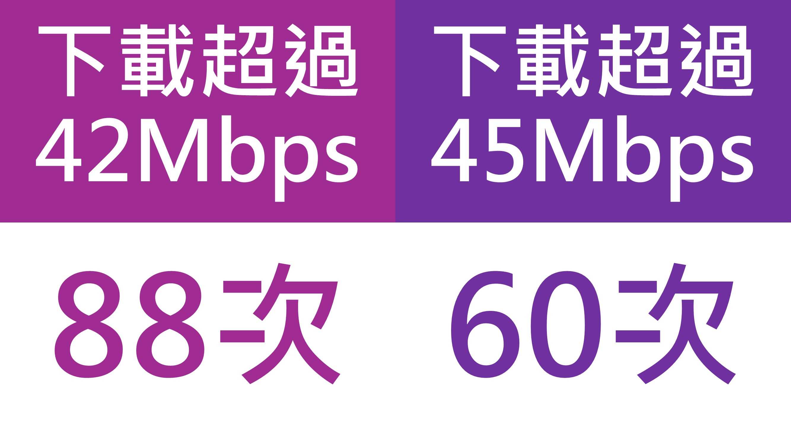 即使官方條款列明 42Mbps 速度上限,實際上鎖速並非太緊,八十八次下載超過 42Mbps,其中 六十次更高於 45Mbps,高據三分一,充分顯示中移動 4G 網絡實力,同時反映 MySIM 設定較寬鬆。