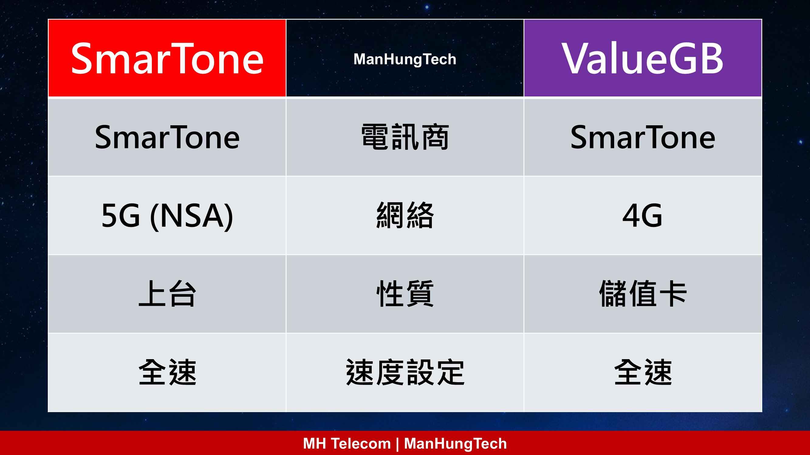 | MH Telecom | SmarTone 5G | ValueGB 4G | 相差% |