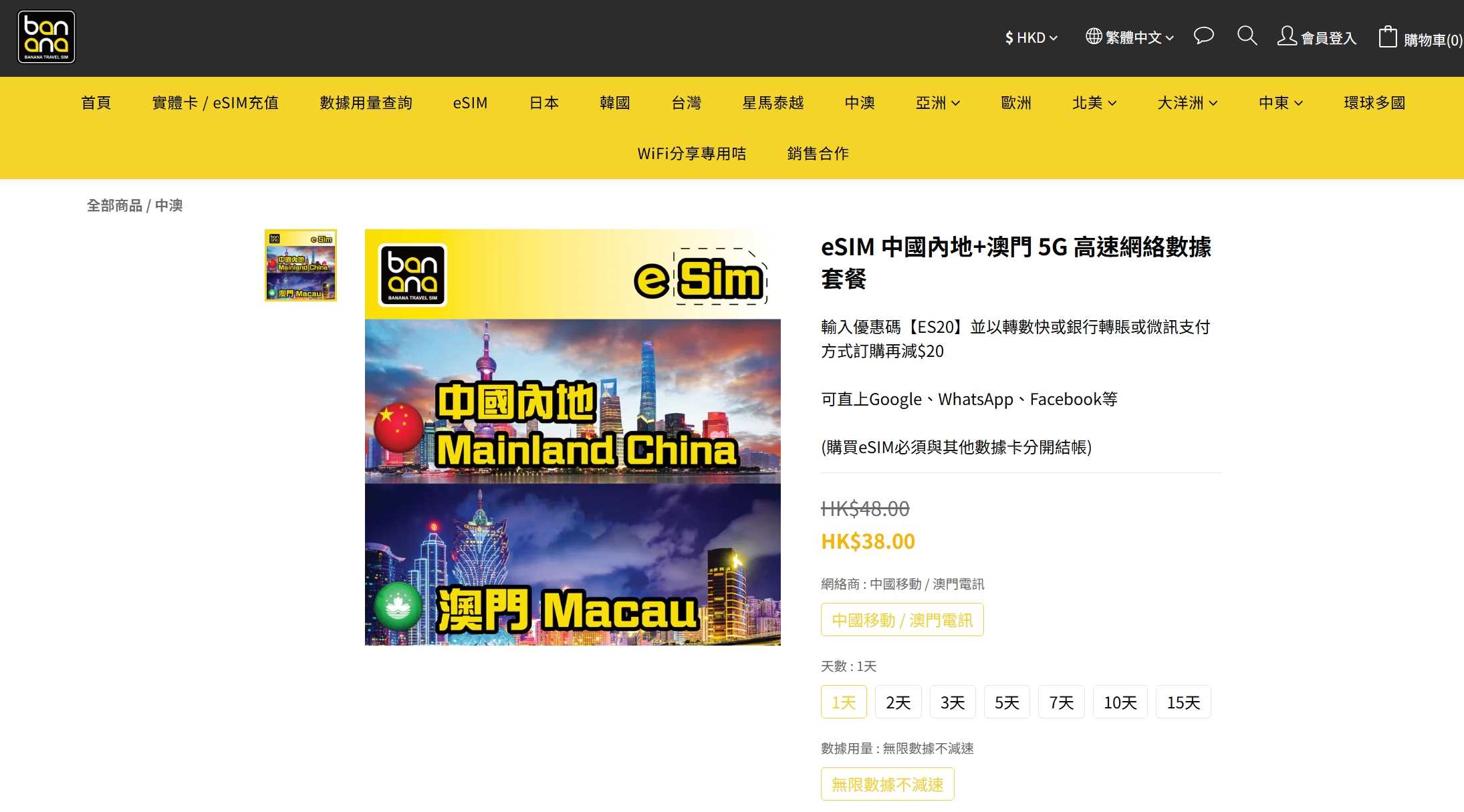 中國內地、澳門 5G eSIM 上網卡可經官網購買,涵蓋一日至十五日,以中國移動 5G、CTM 5G 營運,並標榜無限數據不減速。另有中澳台年卡、52地年卡、69地年卡等 eSIM 產品,詳見相關產品說明。