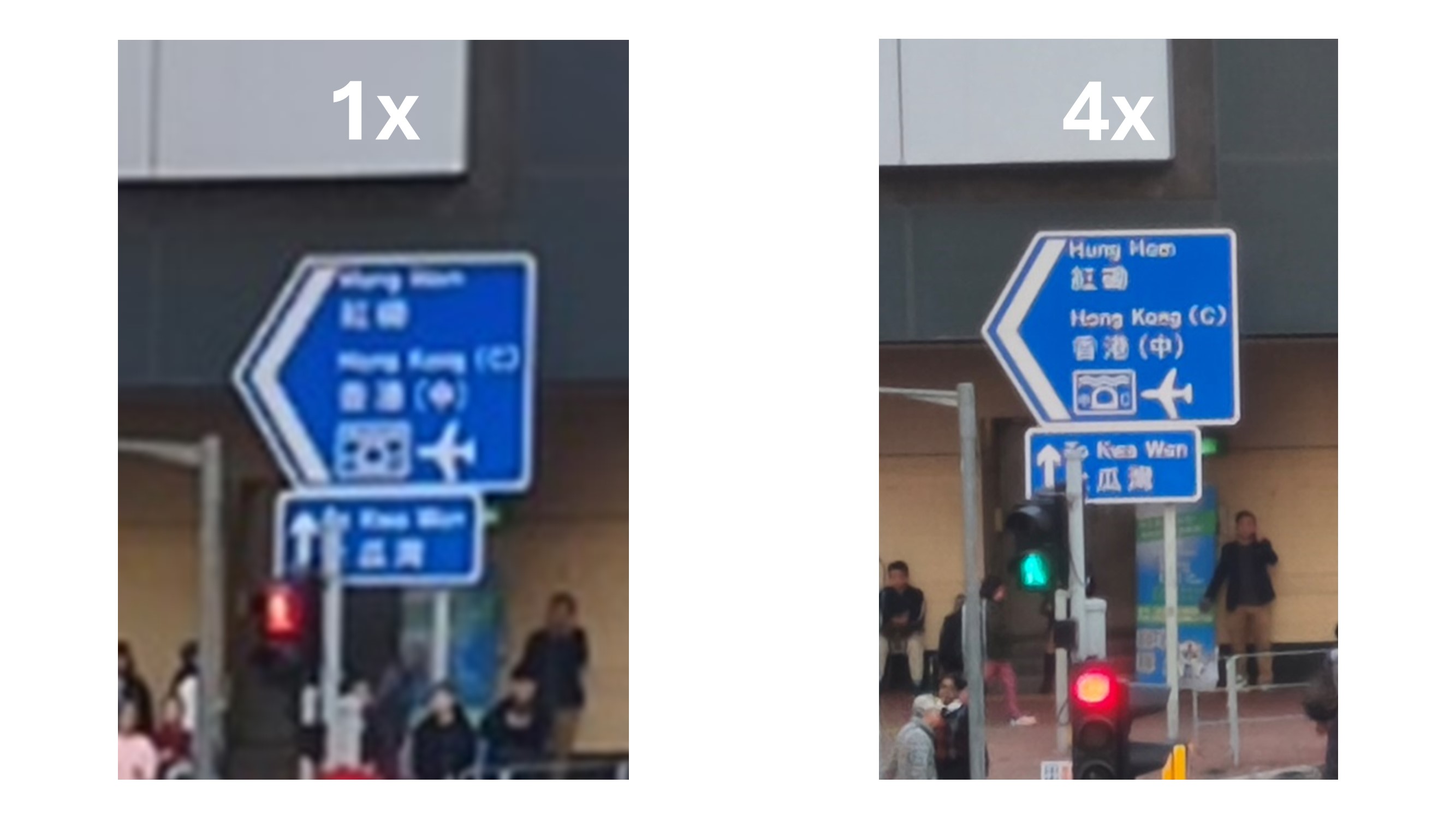 高下立見,4x 成功兼顧兩個路牌所有文字,與 1x 放大後一片模糊近視感立竿見影。