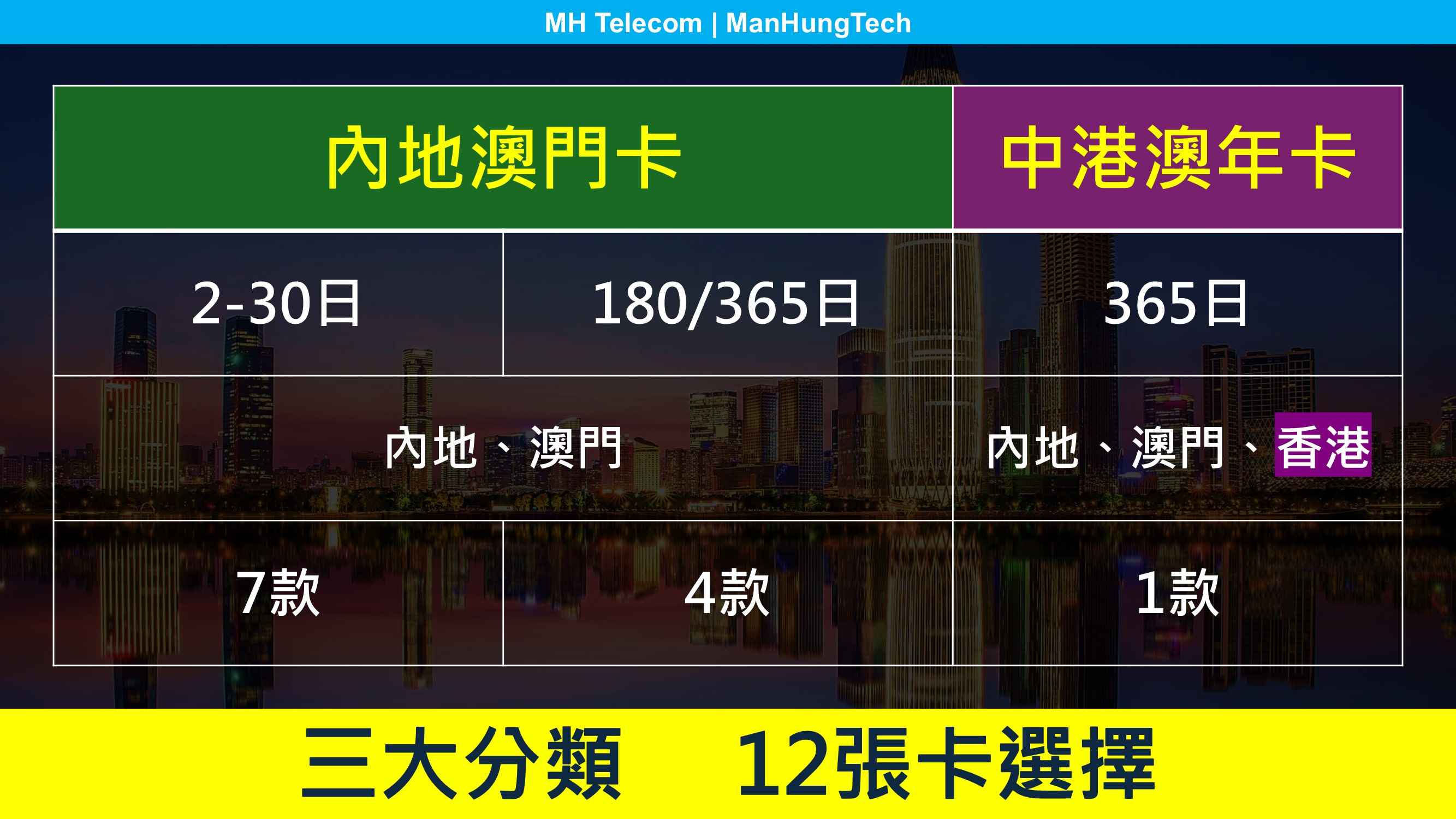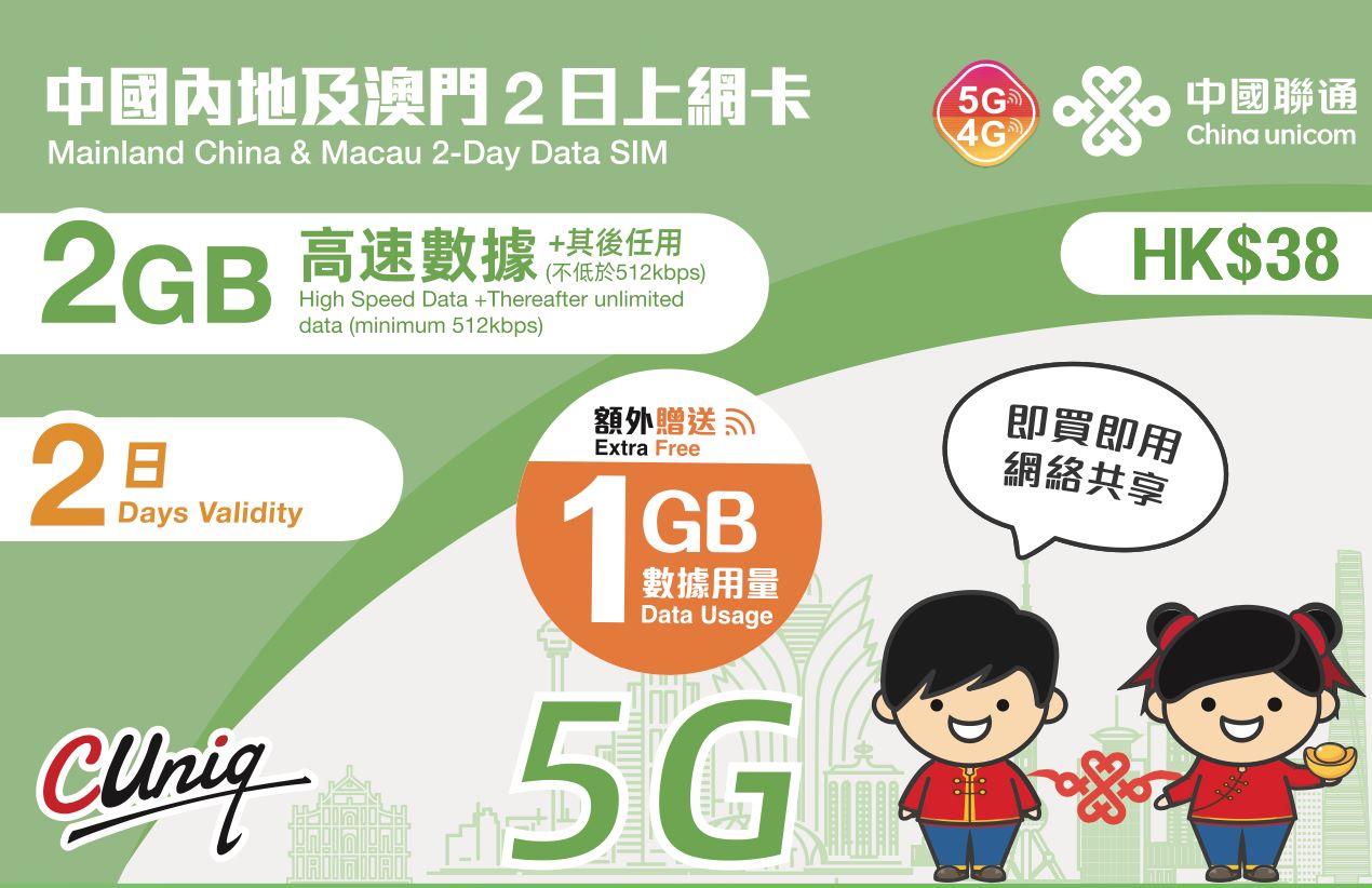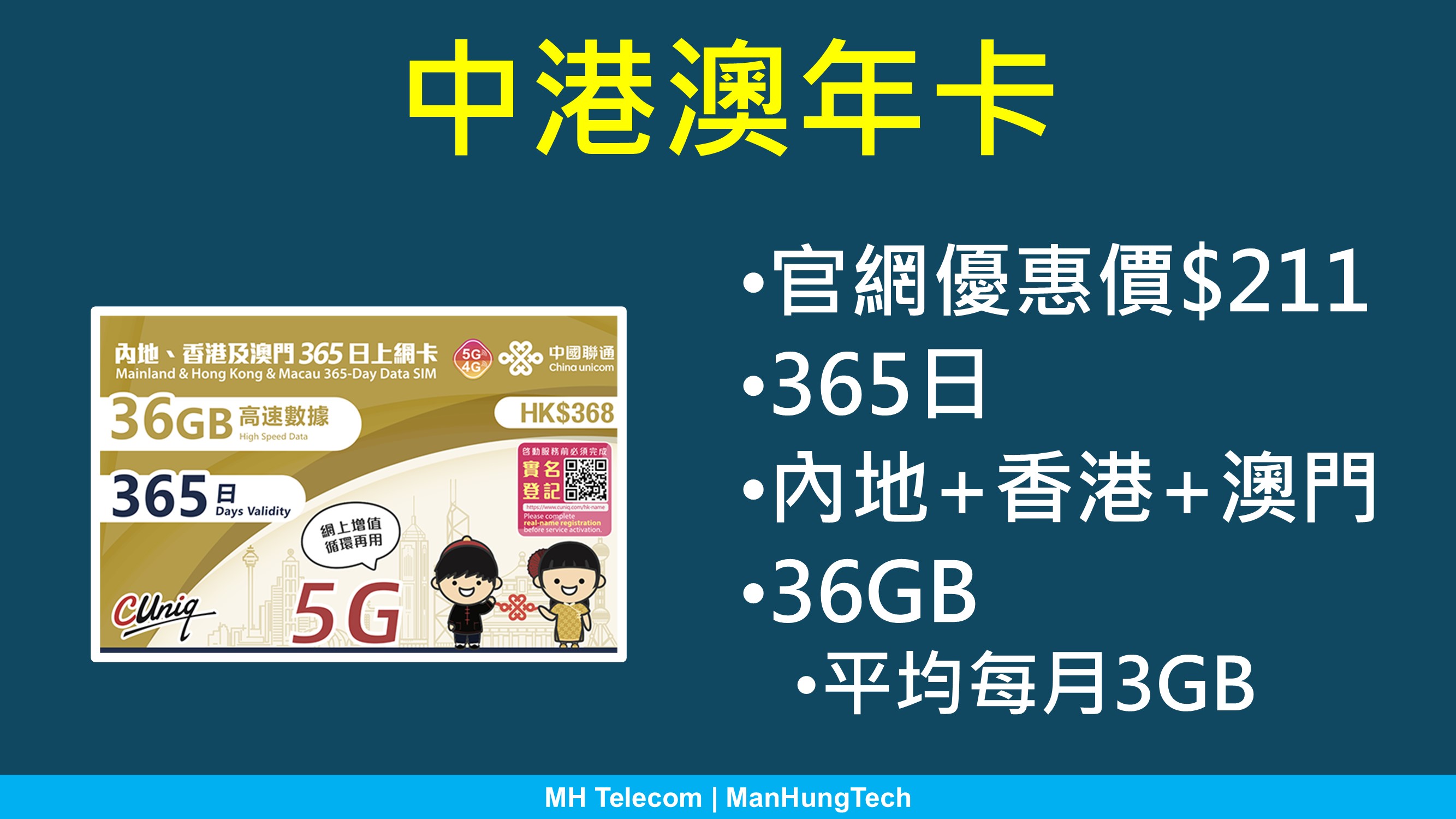 正式名稱為內地、香港及澳門365日上網卡,開卡包含全年 36GB 中港澳三地數據,平均每月 3GB 用量,超出用量後不設無限上網。由於涉及香港服務,此卡要求實名登記。