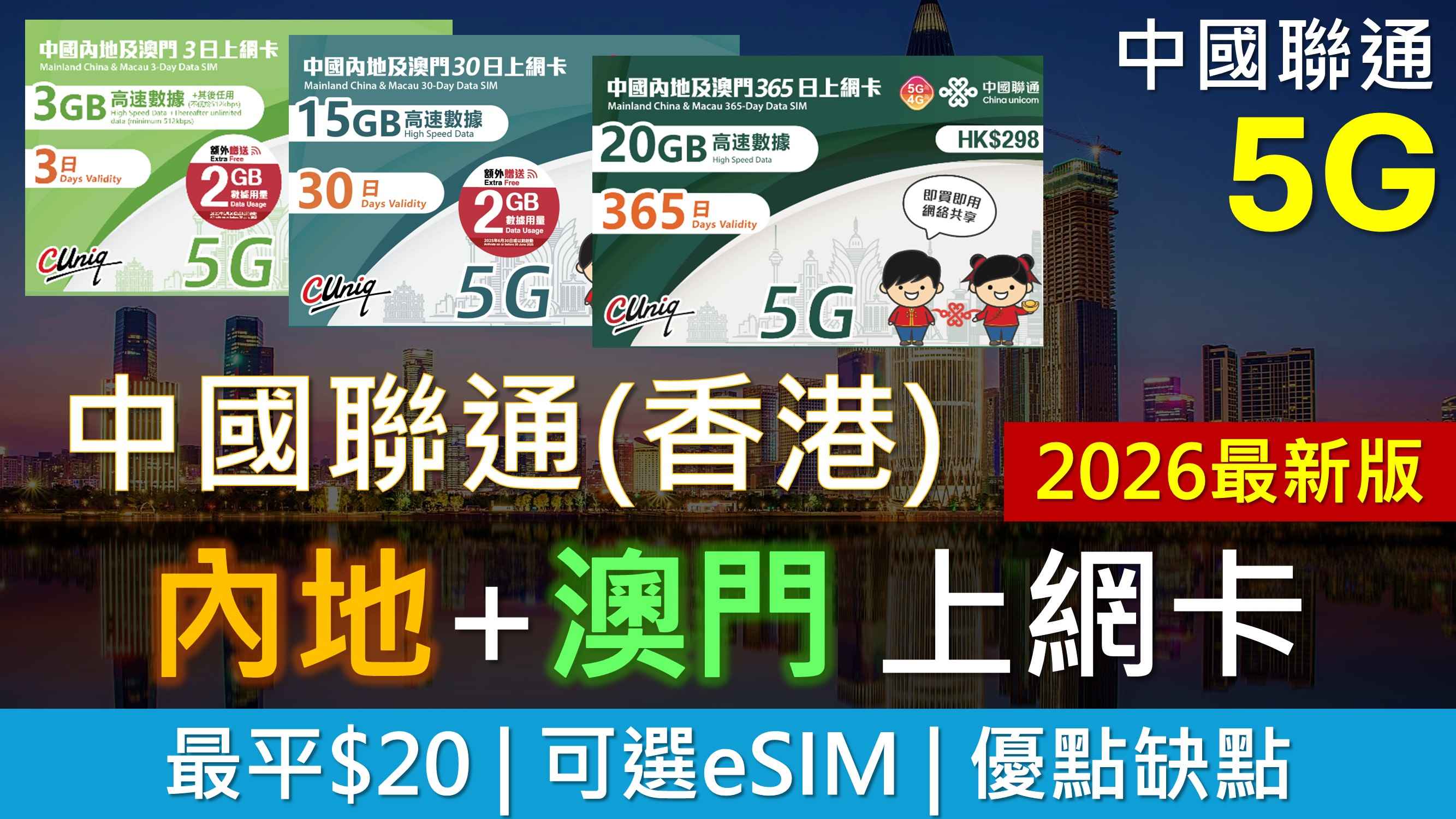 如今中聯通不再經營一卡兩號儲值卡,內地、澳門只有上網卡,代表通話與短訊亦步入歷史。隨著科技日新月異,所有產品已經升級 5G 網絡及 eSIM,並提供不同日數供消費者選擇,數據用量高達 50 GB。本文整理十二款內地澳門上網卡,以及相關實用資訊。