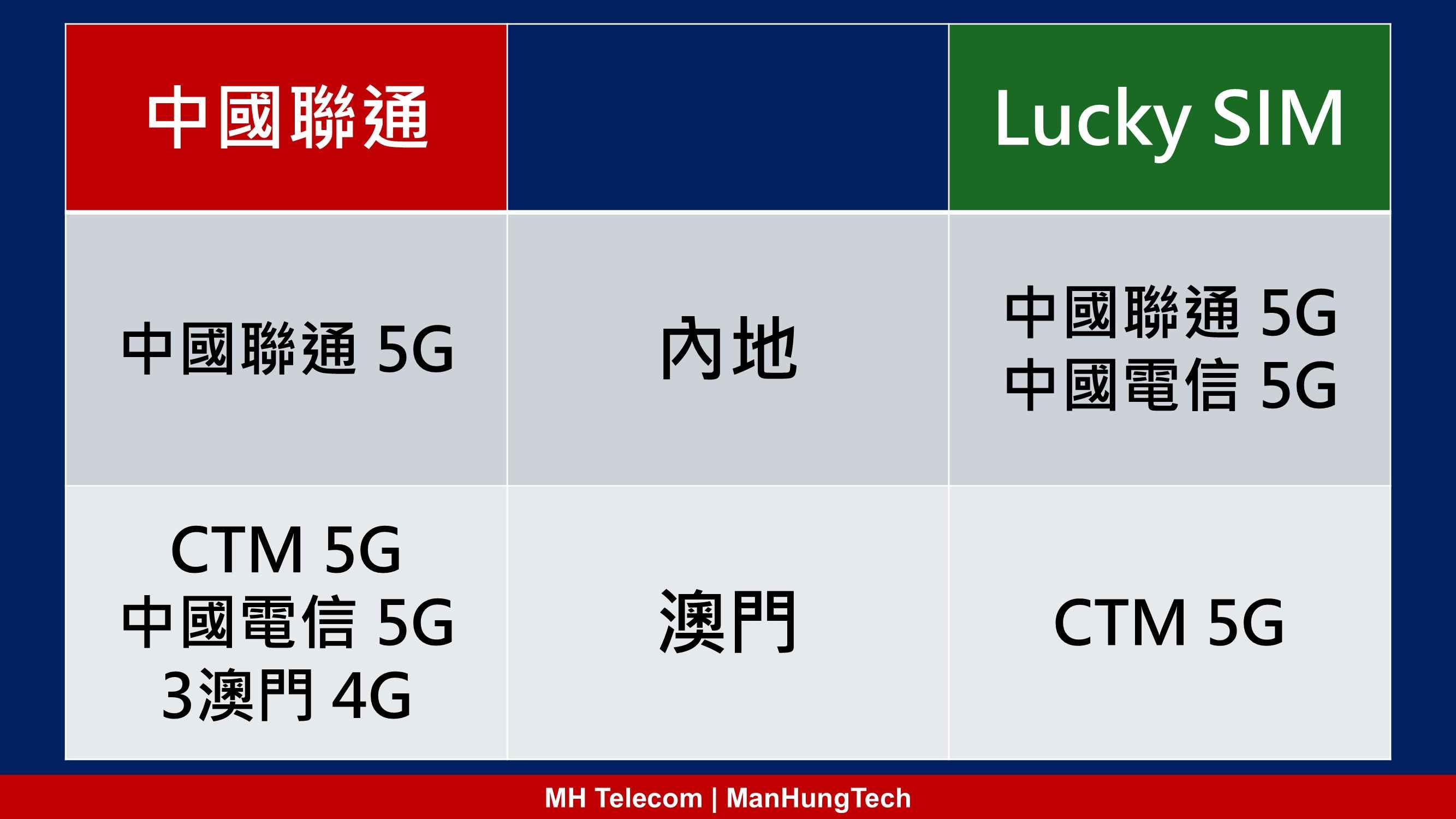 中國聯通(香港)乃市面上幾乎唯一做到澳門三網全通的外遊數據卡,不但用到 CTM 5G、中國電信澳門雙 5G 網絡,更加入3澳門 4G 網絡,覆蓋最為全面;Lucky SIM 則坐擁中國聯通、中國電信雙 5G 網絡,鑑於共建共享方針,實際覆蓋分別未必如想像般大。