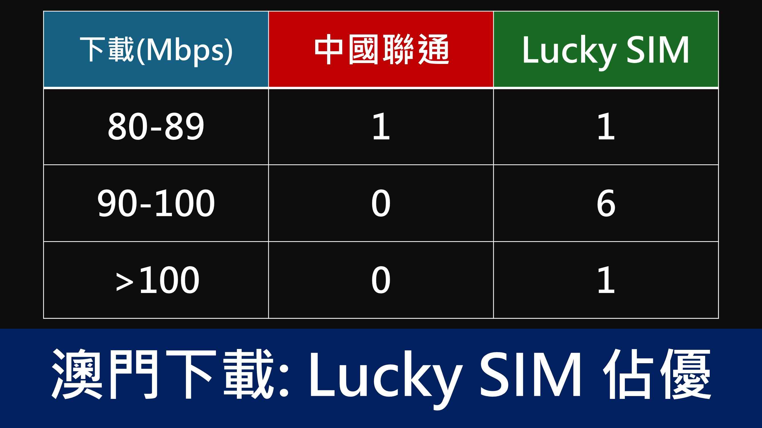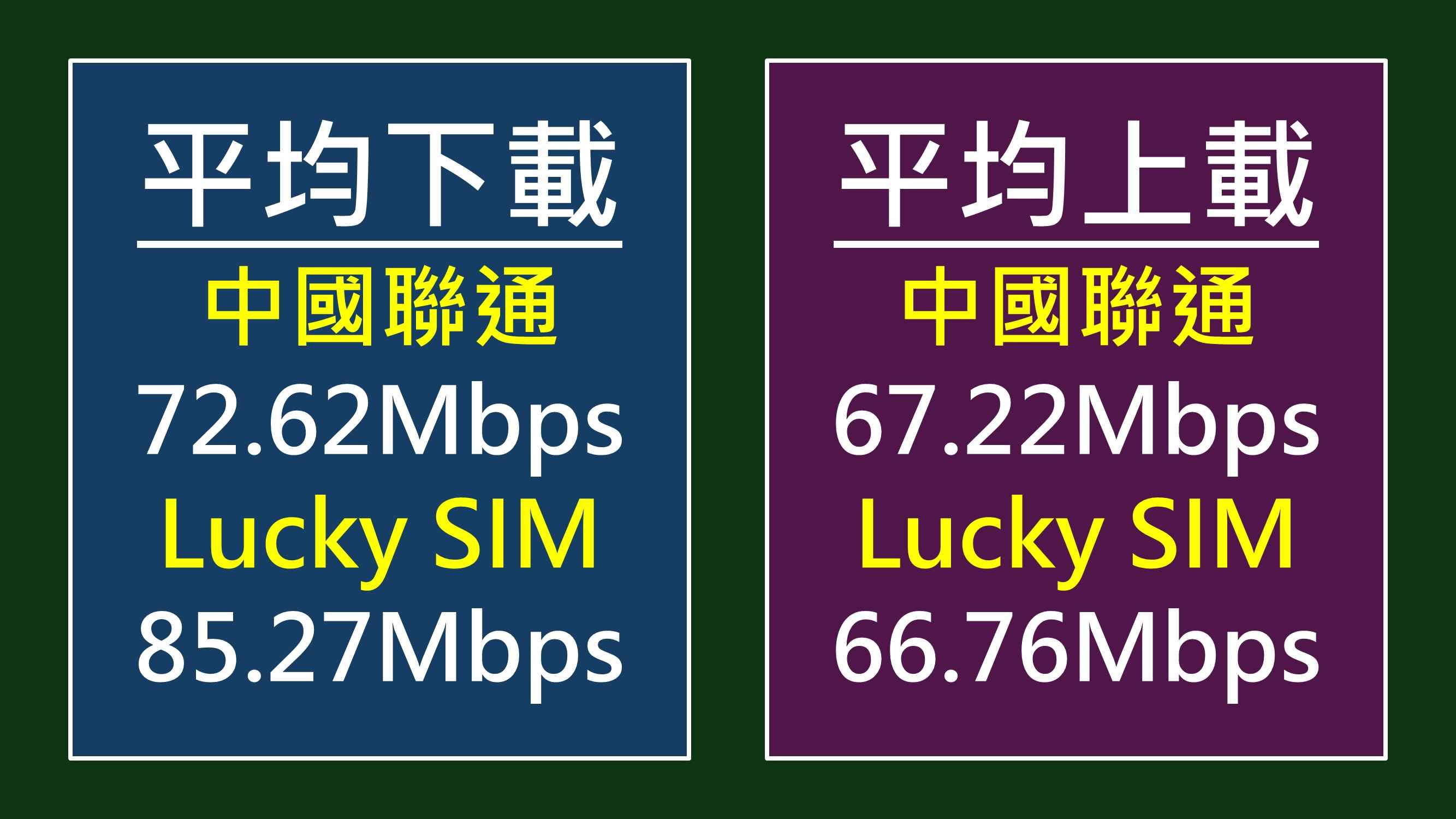 若要仔細比較,中聯通下載能力似乎受阻,無力挑戰 90Mbps,無疑較 Lucky SIM 遜色。撇開單純數字比較,中聯通所有下載至少 50Mbps,對大部分人而言已經夠用,而測試當日也無法憑測速以外的體驗感受任何不及 Lucky SIM。