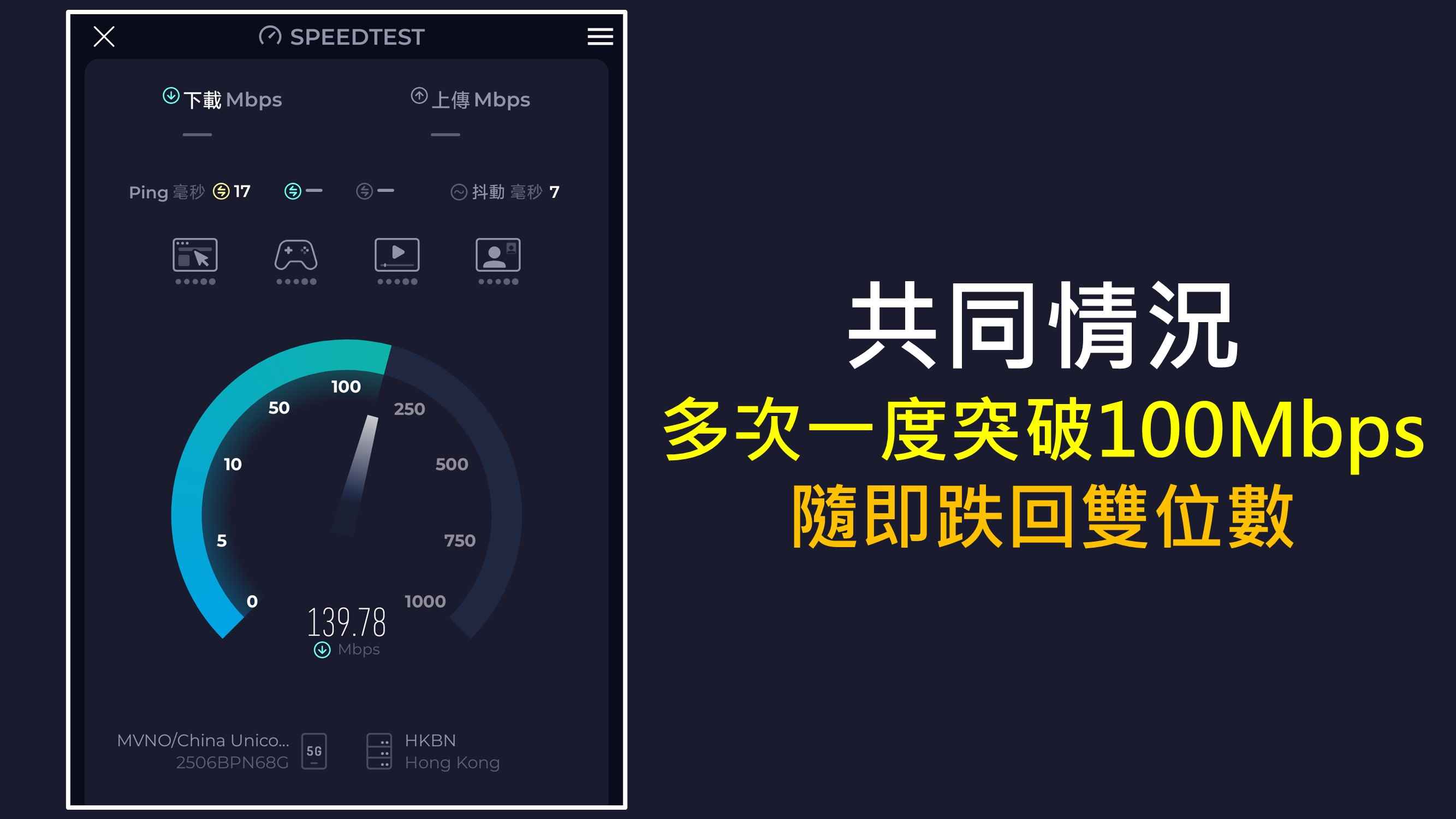 從以上測試數據可見,兩張卡貌似難以超越 100Mbps,有可能歸咎到 CTM 5G 網絡實力。事實上多次測試中途一度超出 100Mbps,甚至 140Mbps 以上,可惜未幾急跌雙位數,背後原因耐人尋味。